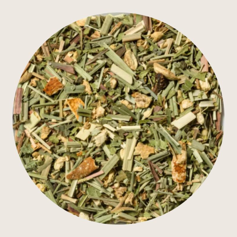 Ingefær, sitrongress, sitronverbena, aroma, steviablader, Manuka honning-granulat (maltodekstrin, Manuka-honning), sitrusskall, limetreblomster.