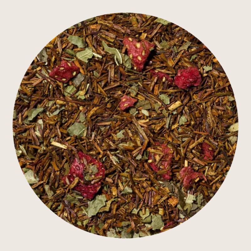 Rooibos, bjørnebærblader, aroma, jordbærbiter.