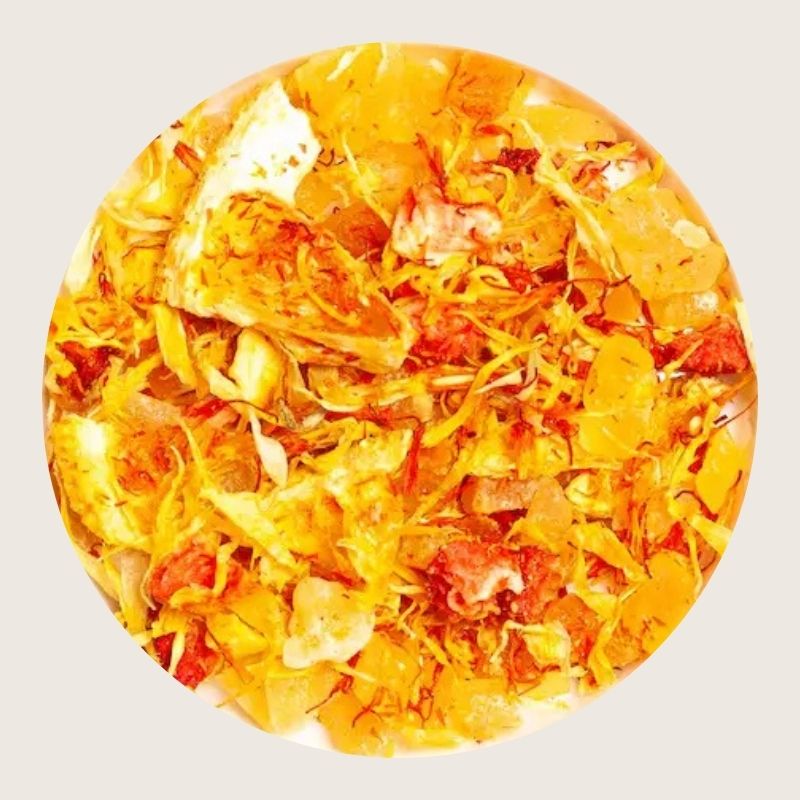 Kandiserte ananasbiter 41 % (ananas, sukker, surhetsregulerende middel (sitronsyre)), kandiserte mangobiter 30 % (mango, sukker, surhetsregulerende middel (sitronsyre)), appelsinskiver, aroma, ringblomst, jordbærbiter, mangofruktgranulat (glukosesirup, mangopuré-konsentrat, fortykningsmiddel (natriumalginat)), safranblomst, sitronsyre, naturlig appelsinaroma, naturlig aroma.