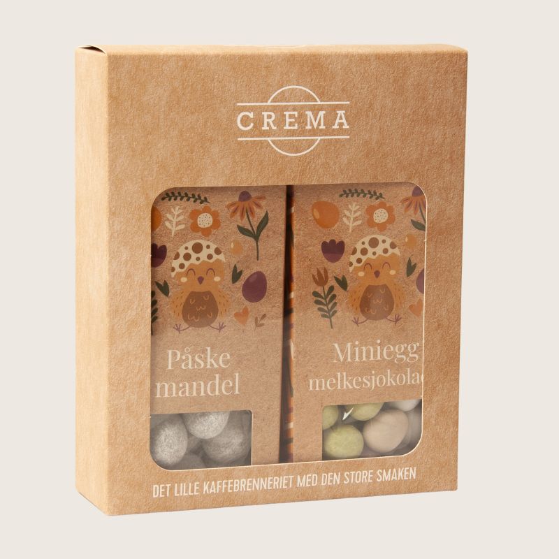 Denne gavepakken kombinerer sprø påskemandler og klassiske miniegg i melkesjokolade – en enkel og hyggelig måte å skape litt ekstra stemning i påsken.
