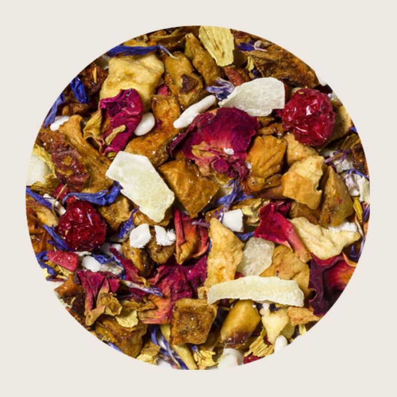 Eplebiter, ananasbiter (ananas, sukker, sitronsyre), kakaosmørbiter (sukker, kakaosmør, dekstrose), ristede kokosflak, aroma, rips, roseblader, bringebærbiter, solsikkeblader, sitronsyre, kornblomstblader.